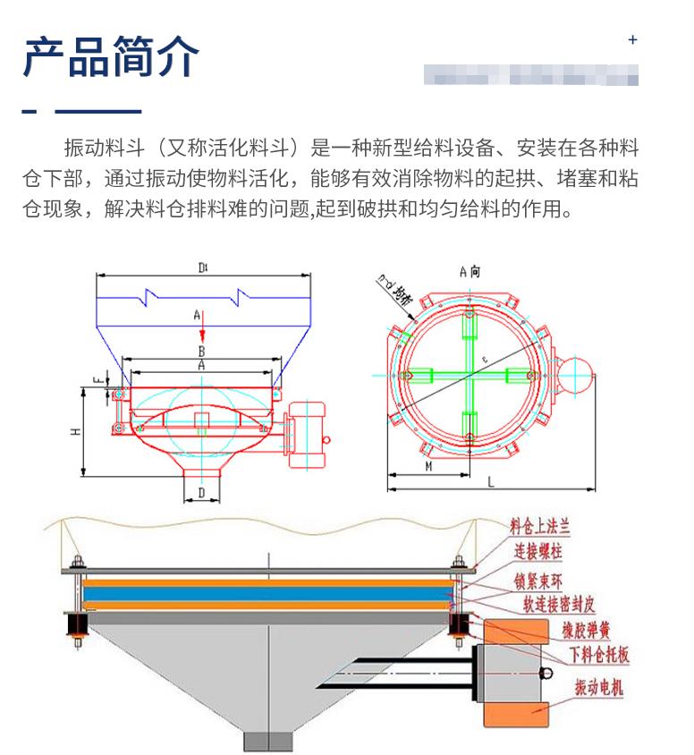 振動料斗主要有振動電機、振動料斗、活化錐、固定斗等部分組成。