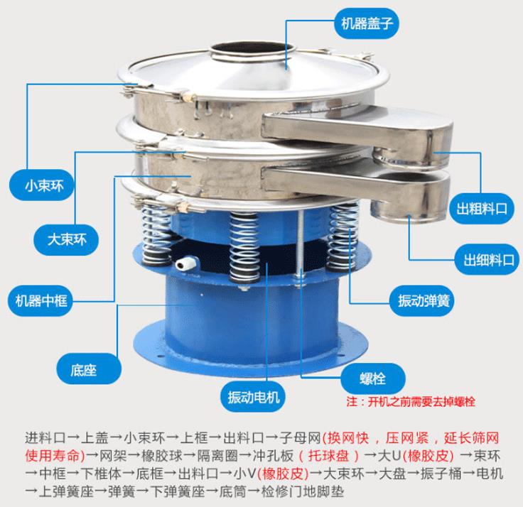 旋振篩是一種高精度細(xì)粉篩分機(jī)械,其噪音低、效率高,快速換網(wǎng)只需3-5分鐘,全封閉結(jié)構(gòu),適用于粒、粉、粘液等物料的篩分過(guò)濾。旋振篩是由直立式振動(dòng)電機(jī)作激振源,電機(jī)上、下兩端安裝有偏心重錘,將電機(jī)的旋轉(zhuǎn)運(yùn)動(dòng)轉(zhuǎn)變?yōu)樗?、垂直、傾斜的三次元運(yùn)動(dòng),再把這個(gè)運(yùn)動(dòng)傳遞給篩面。調(diào)節(jié)電機(jī)上、下兩端的相位角,可以改變物料在篩面上的運(yùn)動(dòng)軌跡。