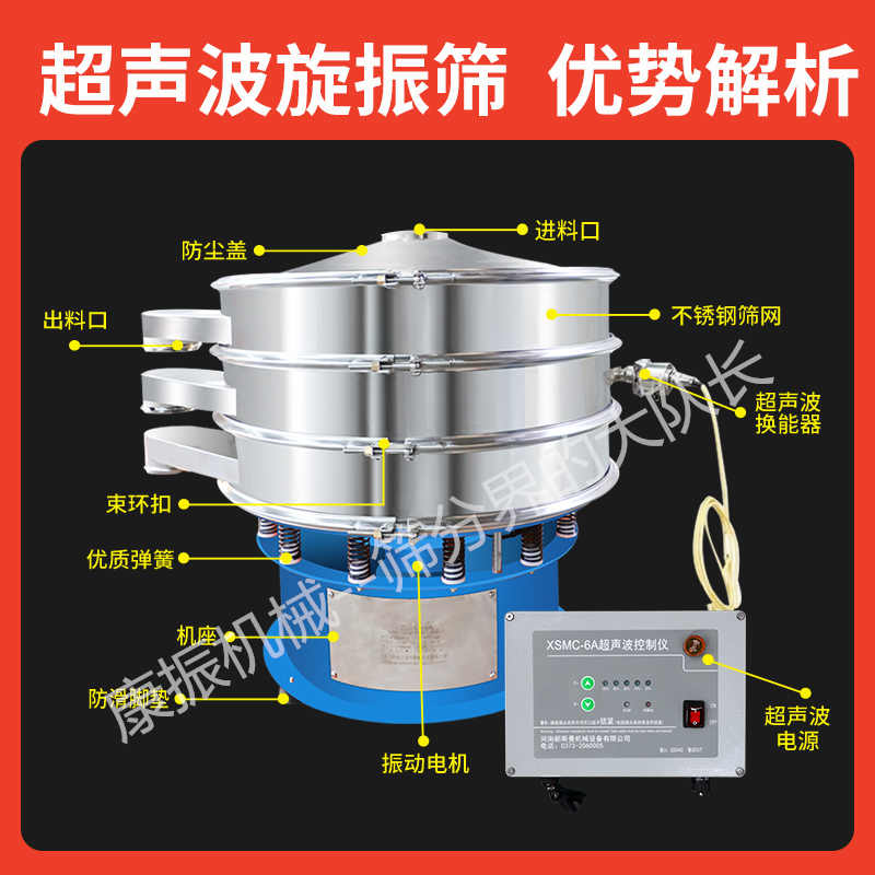 超聲波振動篩是將220V、50Hz或110V、60Hz電能轉(zhuǎn)化為36KHz的高頻電能,輸入超聲換能器,將其變成36KHz機械振動,產(chǎn)生的功率超聲波使篩網(wǎng)作高頻振動。篩網(wǎng)上的物料在作低頻旋振運動的同時,疊加上超聲振動,既可防止網(wǎng)孔堵塞,又可使篩分機提高產(chǎn)量和質(zhì)量,從而達到快速篩分和清網(wǎng)的目的,使超微細粉篩分成為易事。該系統(tǒng)在傳統(tǒng)的振動篩基礎(chǔ)上在篩網(wǎng)上引入一個低振幅、高頻率的超聲振動波(機械波),以改變超微細分體的篩分性能。特別適合高附加值精細分體的用戶使用