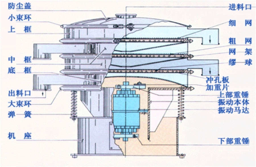 旋振篩是一種高精度細(xì)粉篩分機(jī)械,其噪音低、效率高,快速換網(wǎng)只需3-5分鐘,全封閉結(jié)構(gòu),適用于粒、粉、粘液等物料的篩分過(guò)濾。旋振篩是由直立式振動(dòng)電機(jī)作激振源,電機(jī)上、下兩端安裝有偏心重錘,將電機(jī)的旋轉(zhuǎn)運(yùn)動(dòng)轉(zhuǎn)變?yōu)樗?、垂直、傾斜的三次元運(yùn)動(dòng),再把這個(gè)運(yùn)動(dòng)傳遞給篩面。調(diào)節(jié)電機(jī)上、下兩端的相位角,可以改變物料在篩面上的運(yùn)動(dòng)軌跡。
