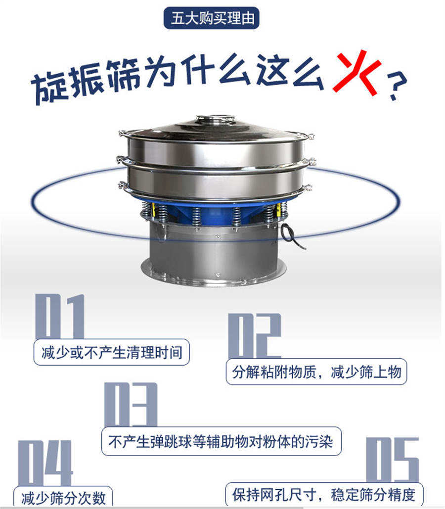 篩選范圍廣--只有系列三次元旋振篩能分選如此廣的原料范圍:任何顆粒、細(xì)粉、漿液都可以篩選。篩分細(xì)500目(28微米),過(guò)濾細(xì)5微米。網(wǎng)孔防堵塞--三次元振動(dòng)功能及自動(dòng)清理堵網(wǎng)裝置把堵網(wǎng)幾率降到小。 單層或多層分選--每臺(tái)旋振篩可選一至五層篩網(wǎng),能同時(shí)進(jìn)行二到六個(gè)等級(jí)的分選或過(guò)濾。