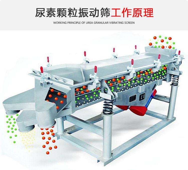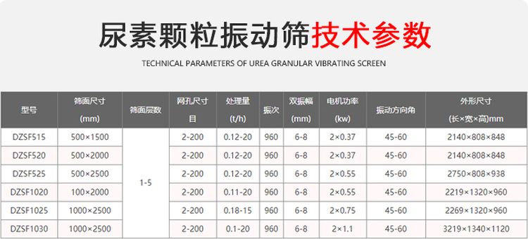 尿素顆粒振動篩有:DZSF-515、DZSF-520、DZSF-1020、DZSF-1025、DZSF-1030、DZSF-1035、DZSF-1540等長、寬、高不同的機(jī)型。