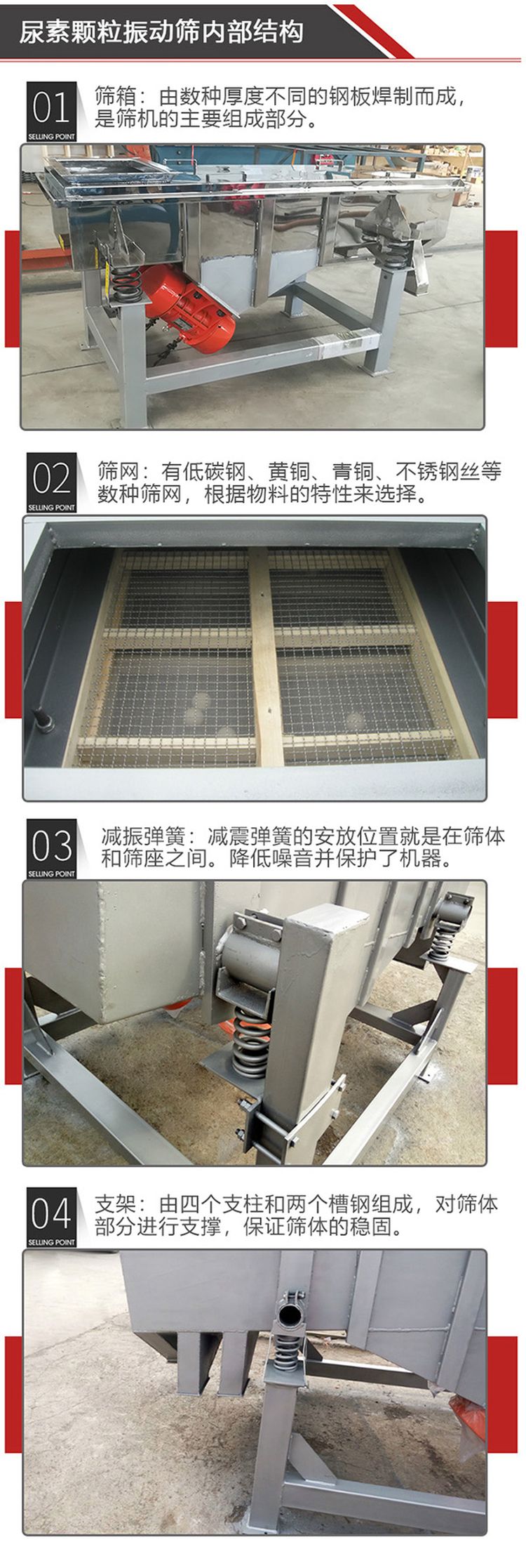 尿素顆粒振動篩主要由篩箱、篩框、篩網(wǎng)、振動電機(jī)、電機(jī)臺座、減振彈簧、支架等組成。