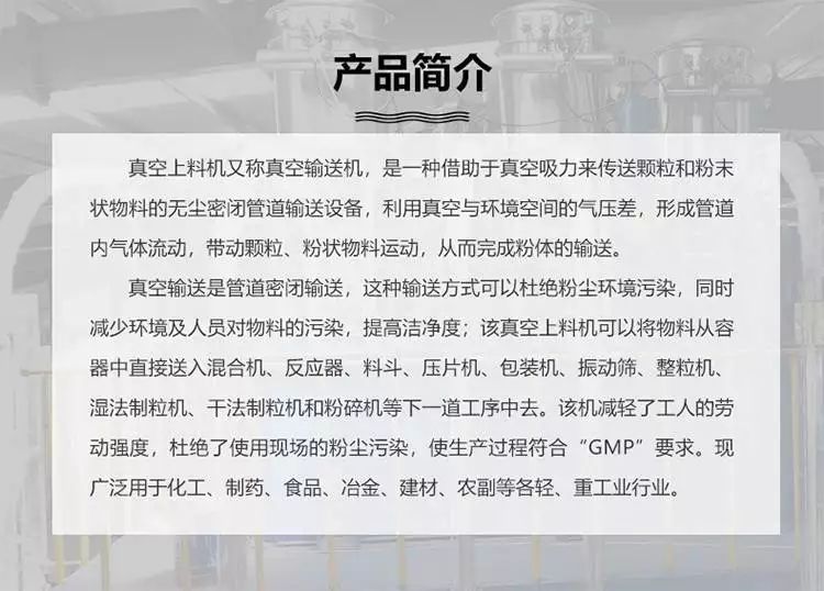 ZKS系列真空上料又稱真空輸送機,是通過氣體產(chǎn)生真空輸送粉體料的設(shè)備,是氣體輸送的一種。適用于醫(yī)藥、食品、化工、冶金、建材等多個行業(yè),針對各種粉體物料的密閉輸送,提高物料的潔凈度,能滿足不同客戶的多種輸送需要。
